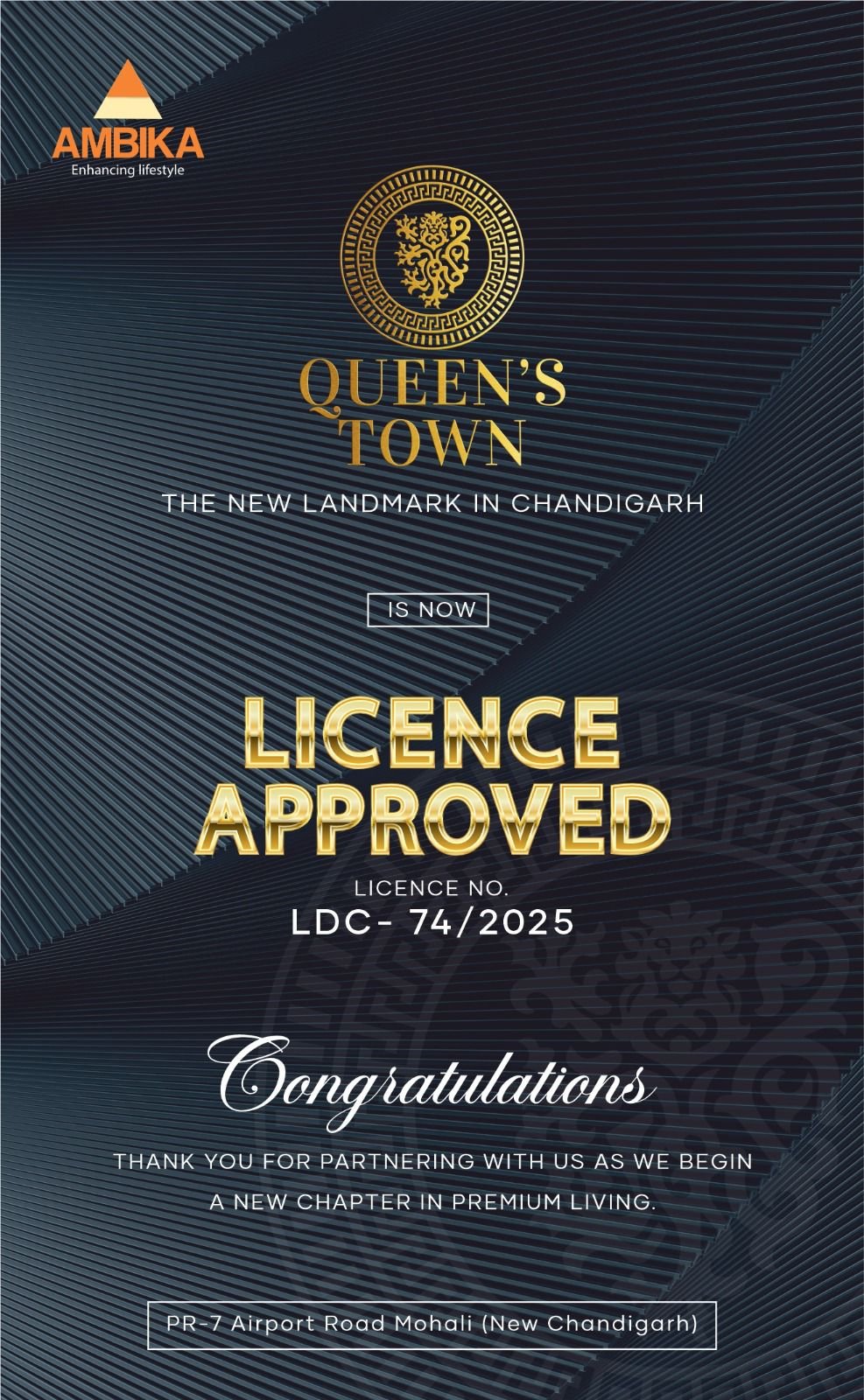 We are thrilled to announce that Ambika Queens Town, the new landmark in Chandigarh, is now Licence Approved under Licence No. LDC-74/2025. This marks a major milestone for us and for everyone who has placed their trust in our vision of premium living.