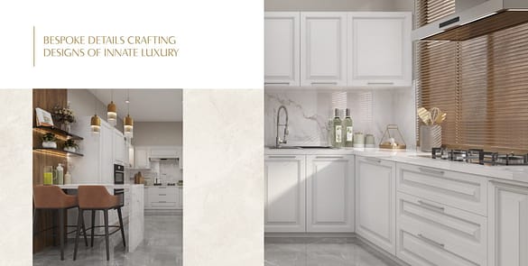 Cabinets - Premium Modular Kitchen cabinets of Appropriate Finishes (Hettich) with Branded Washing Machine/RO/Chimney/Hob/Geyser Flooring Anti skid Vitrified tiles (Kajana/Quton/Simpolo or Equivalent).Dado - Premium Vitrified Tiles up to 2 ft. above the counter Wall Finishes - Vitrified Tiles/Premium Emulsion Paint Ceiling - Premium Emulsion Paint, Illuminated False Ceiling Counter - Premium Quartz Equipment Built-in Microwave (25-30 Ltr) and OTG (25-30 Ltr), Refrigerator (600Ltr), Dishwasher (12 Plate setting)